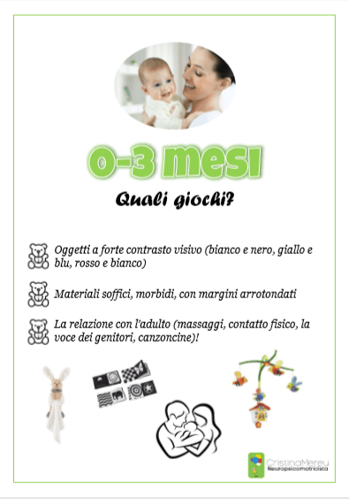 Si suggerisce l’utilizzo di oggetti a forte contrasto visivo (bianco e nero, giallo e blu…), di materiali soffici, morbidi ma, sopratutto, ciò che conta maggiormente in questa fase, è la relazione con i genitori: coccole, massaggi, contatto fisico, voce…