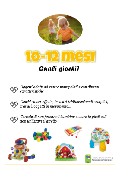 Si suggerisce l’utilizzo di oggetti adatti ad essere manipolati e con diverse caratteristiche, giochi causa-effetto, incastri tridimensionali semplici, travasi, oggetti in movimento (palline, macchinine…). Risulta, inoltre, fondamentale non forzare il bambino a stare in piedi in quanto ogni bambino impara a camminare quando si sente pronto. A tal proposito si sconsiglia l’uso del girello che non è assolutamente d’aiuto nell’acquisizione del cammino.