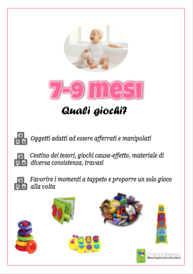 Si suggerisce l’utilizzo di oggetti adatti ad essere afferrati e manipolati, giochi come il cestino dei tesori, causa-effetto, travasi… è importante favorire i momenti a tappeto e proporre un solo gioco alla volta.