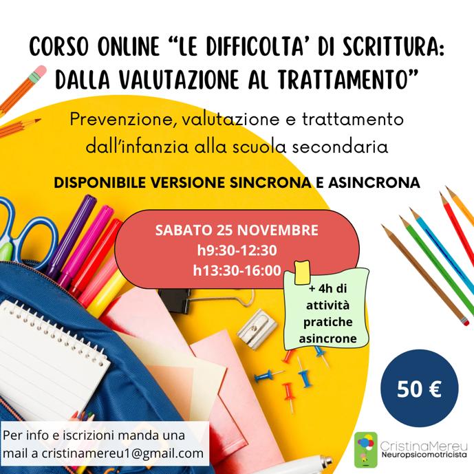 La II edizione del corso online “Le difficoltà di scrittura: dalla valutazione al trattamento” è ora disponibile. Il corso si terrà in modalità sincrona online il 25 novembre alle 9:30. A partire dal 26 novembre, sarà possibile accedere alla versione asincrona del corso, che includerà registrazioni e materiali didattici.