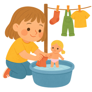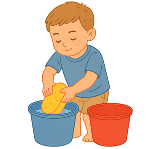 Come si gioca: Preparate bacinelle con acqua e sapone neutro. I bambini lavano vestiti di bambole o piccoli giochi, li sciacquano e li stendono con le mollette su un filo.