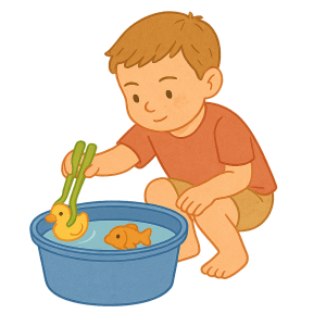 Come si gioca: In una bacinella o piscina gonfiabile, mettete piccoli oggetti galleggianti (palline, animaletti di plastica). I bambini, usando le pinze, devono “pescare” il maggior numero possibile di oggetti in un tempo stabilito.