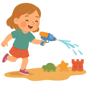 Come si gioca: Su una superficie sicura (sabbia, erba o tappetone), predisponete una serie di formine o piccoli bersagli colorati posizionati a diverse distanze. Il bambino, in piedi su un solo piede, deve colpirli con un getto proveniente da una pistola ad acqua.